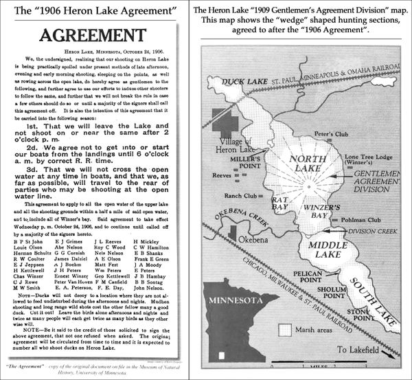 In the early 1900s, concerned individuals from the Heron Lake hunting community, signed a document known as the "1906 Agreement". This agreement stated that waterfowl hunting would only occur at certain times of the day and disturbance would be limited to provide migrating waterfowl a chance to feed and rest.